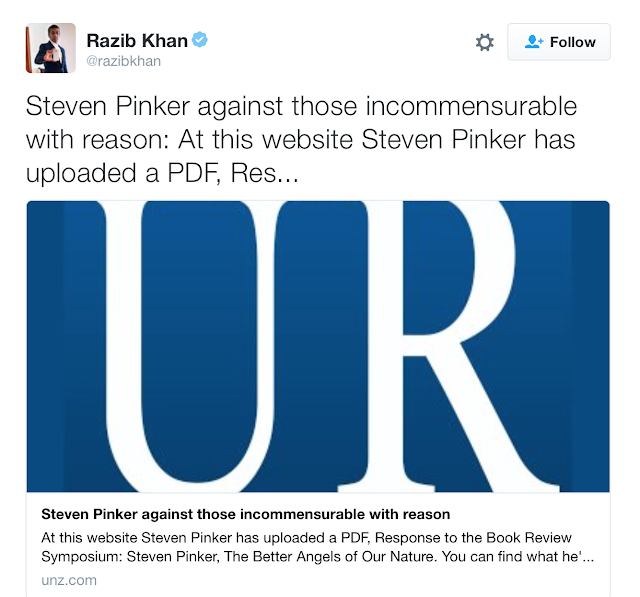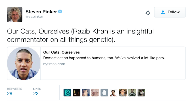 I have long wondered why there is no mainstream media interest in the connection between Steven Pinker, a well-known writer of books about science, history, etc for a general audience and Razib Khan, identified by no less than Breitbart as an intellectual of the alt-right movement.Khan denied a connection to the alt-right, but the White Nationalists know a good source for biology-based justifications for white supremacy when they read it.